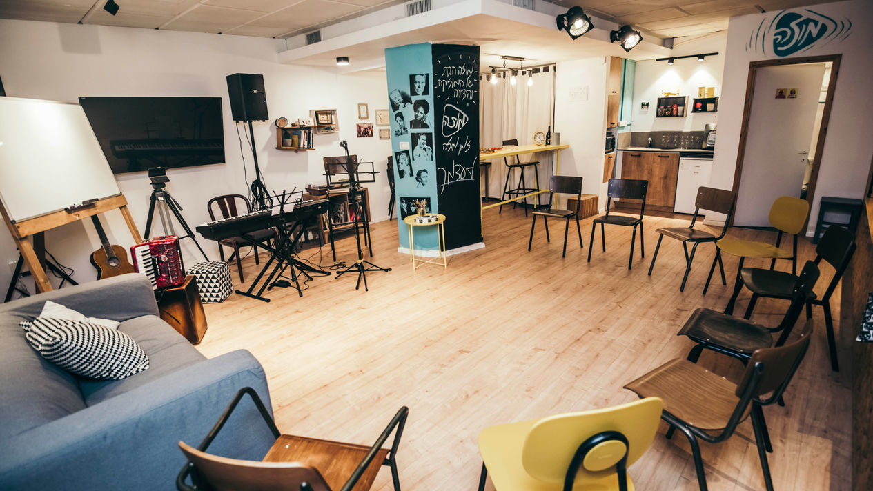 בחלל הקומפקטי נערכות מגוון רב של פעילויות בעלות דינמיקה שונה בתחום המוסיקה. בנוסף קיימים בו מטבחון, שירותים וחלל אחסון לציוד הסדנאות הרב. הקונספט העיצובי נבנה תוך סיעור מוחות פואטי עם הבעלים. האתגר העיצובי היה תרגום אופיו הייחודי של המקום לחומר, שמירה על ה"מוזאיות" אבל גם שחרור וחידוש. אלו וגם הצורך בכסאות נוחים, בפתרון ליער הציוד המתחלף וחיבתה העזה של העלת המקום לצבע הצהוב, הובילו אותי לתכנון חלל גמיש שיש בו נגיעה תעשייתית אבל הוא גם חמים ומאפשר, כחומר ביד היוצר. הקיר החיצוני בו נטועים שני חלונות רחבים קיבל חיפוי osb ועץ אלון, החלונות הולבשו כנישות ישיבה עוטפות, מקום לתפוס בו השראה לכתיבה או לשבת בנוחיות לצפיה בהופעה. את הישיבה מרפדות כריות ג'ינס אותן תפרנו מג'ינסים ישנים. בר קיים לאירוח ולישיבה גבוהה עשוי עץ וצינורות אינסטלציה נצבע מחדש "בצהוב חמניה" והוא נעוץ בתווך בין אזור האירוח לחלל אחסון אחורי שטופל והוצנע באמצעות וילון לבן. שלוש מגרות ישנות וארגז שנרכשו בחנות יד 2 הפכו לכוננית מגניבה לפטיפון וספרי שירה, רהיט שיש בו תנועה וגרוב. העמוד הנטוע בלב החלל משמש ככוננית מדפים סודית מצידו הפנימי וכלוח השראה והודעות מתחלפות בפאותיו החיצוניות. בנוסף נרכשו קולקציית כסאות אקלקטית , תאורה מקצועית, ושופצו המטבחון והשירותים.